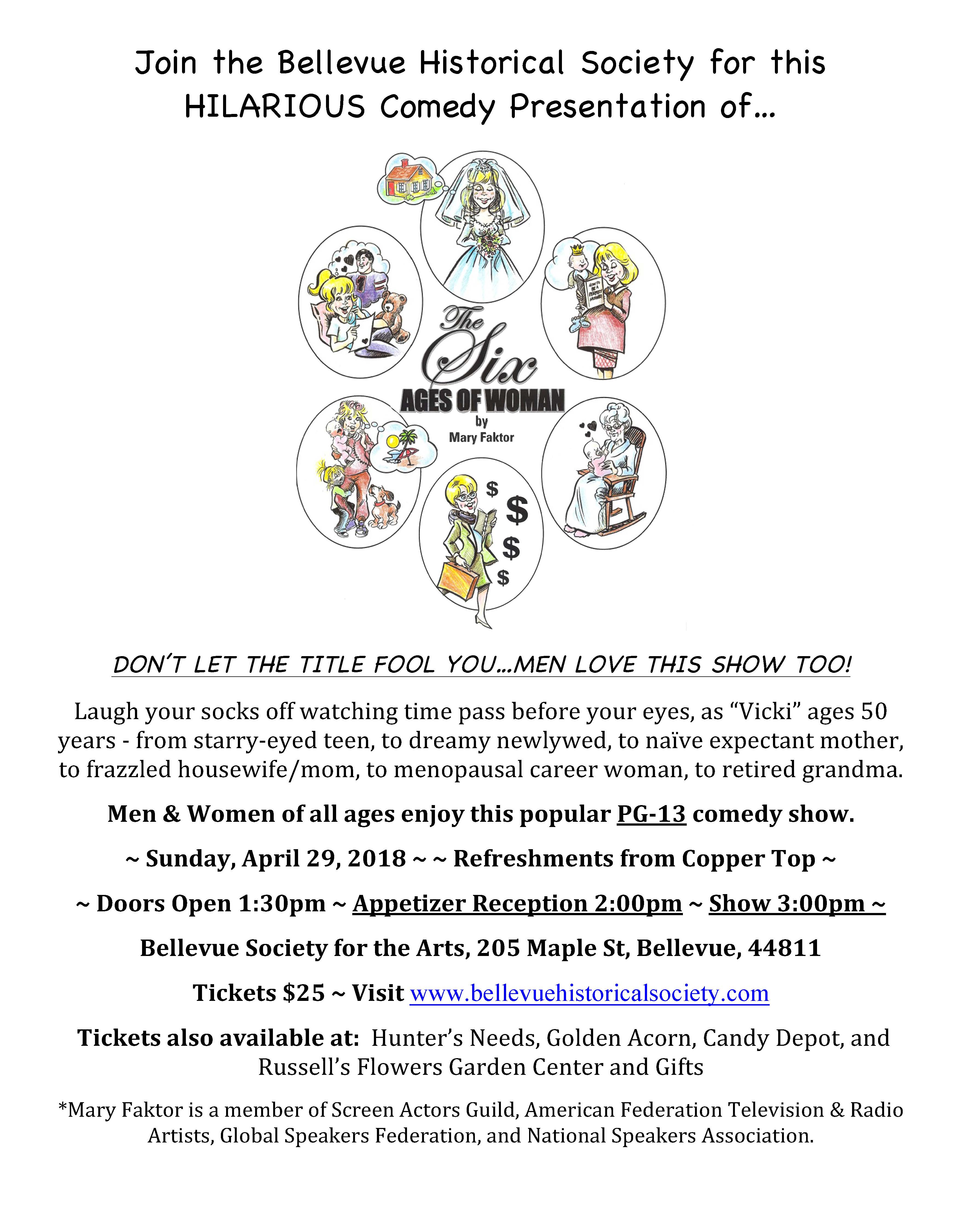 Join the Bellevue Historical Society on Sunday, April 29th for an afternoon of comedy fun! Comedienne Mary Faktor brings her hilarious one-woman show, The Six Ages of Woman, to the Bellevue Society for the Arts, 205 Maple St., Bellevue. Ticket includes a scrumptious selection of appetizers and desserts by Copper Top Bake Shop. Please see the poster below.