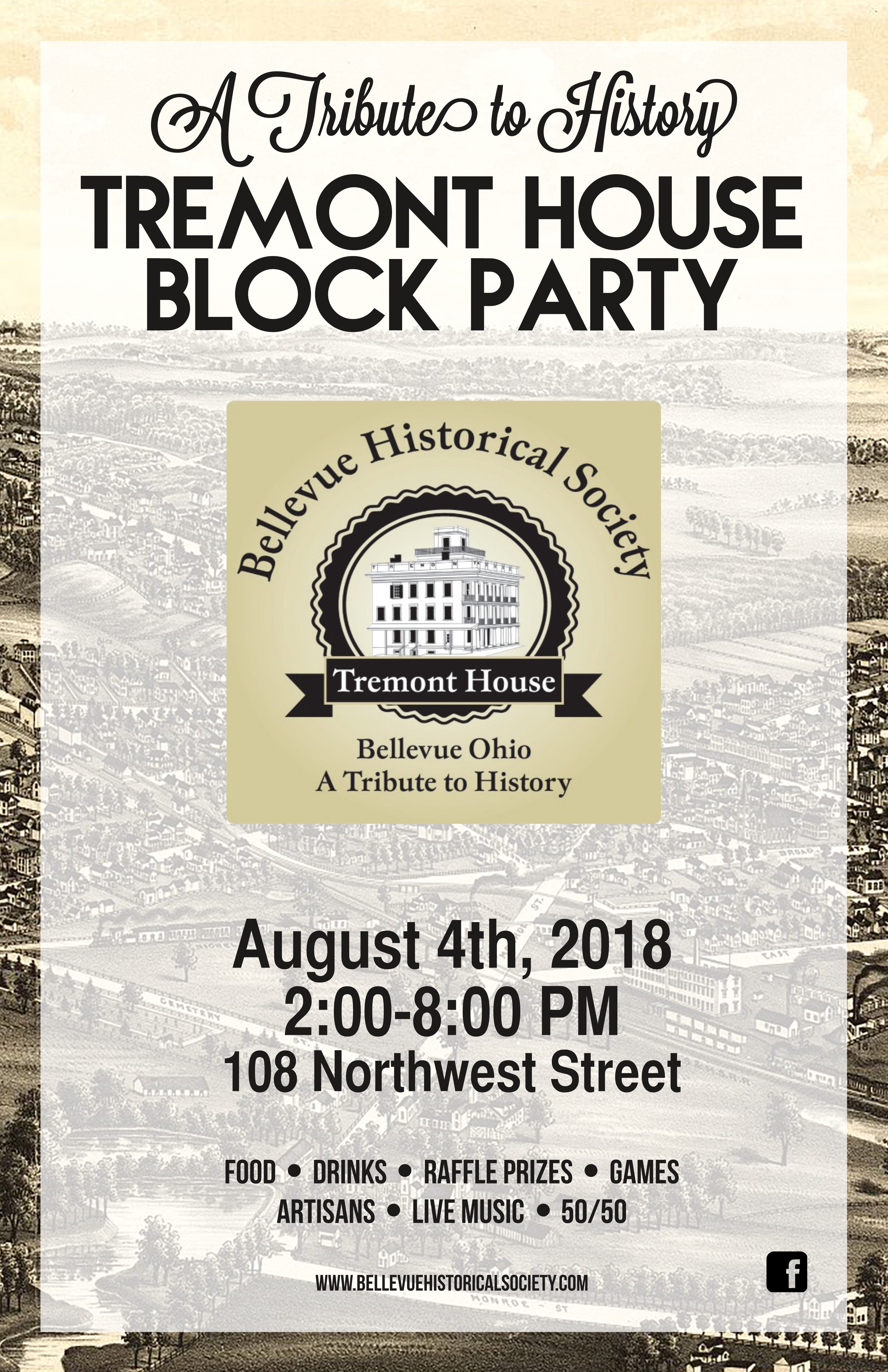 The Bellevue Historical Society’s signature fundraising event, The Tremont House Block Party, will be held on August 4, 2018 from 2 p.m. to 8 p.m.